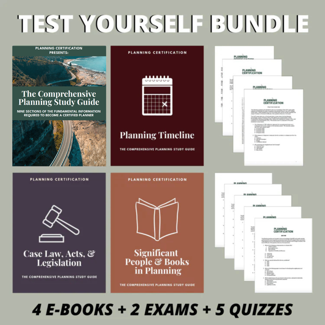 We created the Test Yourself Bundle to give aspiring certified planners everything they need to succeed. With over 150 pages of comprehensive study material—covering planning history, landmark case law, key dates, and influential figures—this bundle is your all-in-one AICP prep solution.
